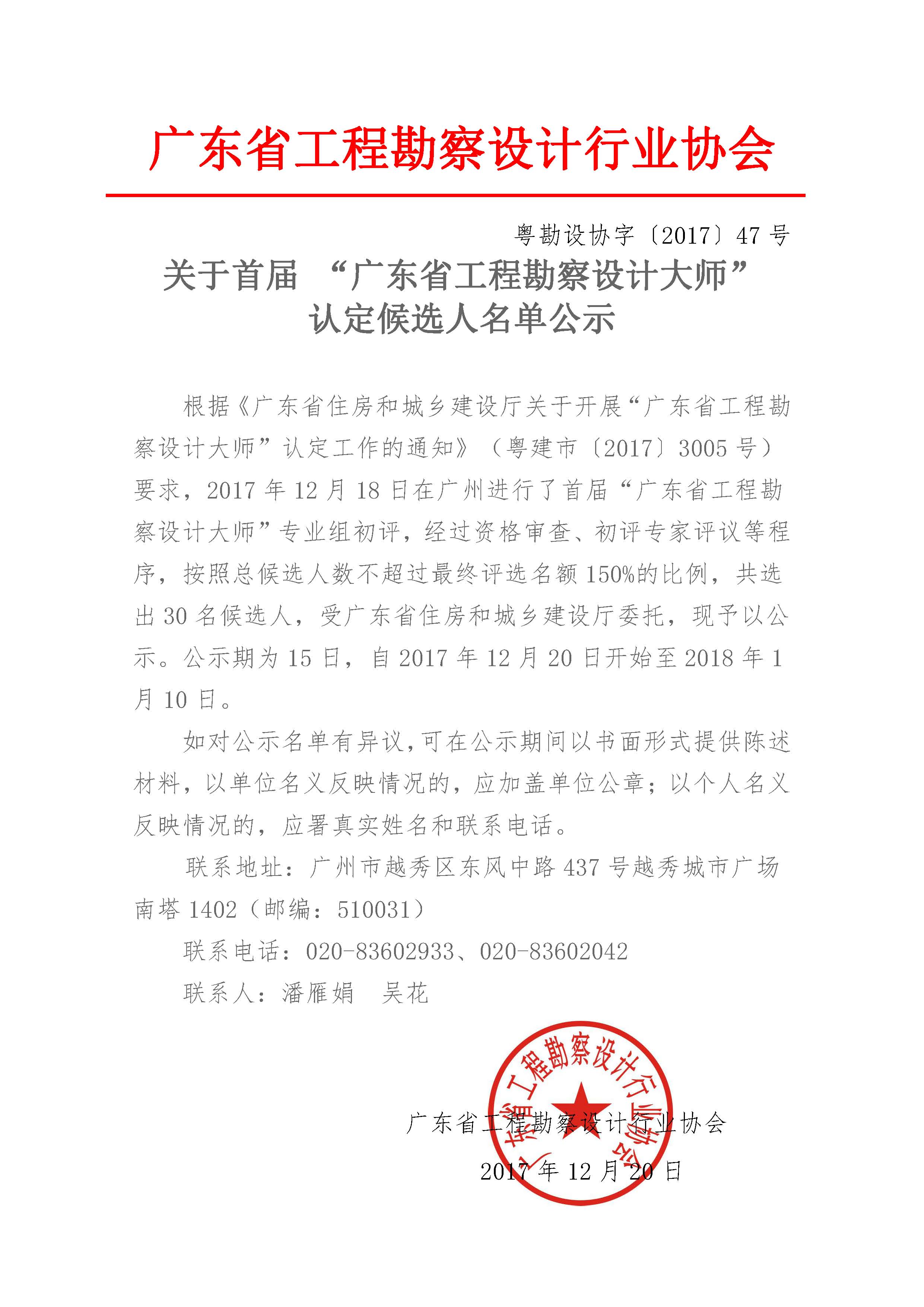 转《关于首届 “广东省工程勘察设计大师”认定候选人名单公示》