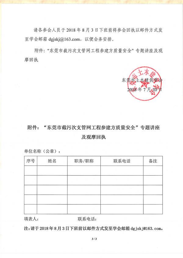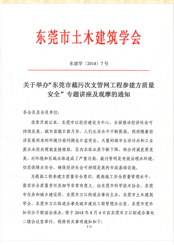 转《关于举办“东莞市截污次支管网工程参建方质量安全”专题讲座及观摩的通知》